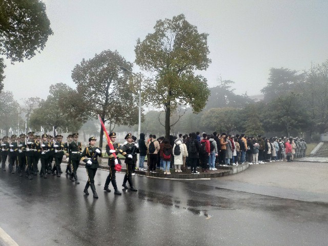6时40分整,升旗仪式正式开始。国旗护卫队踏着整齐划一的步伐,护送国旗来到一教前。升国旗,奏国歌,大家怀着满腔的爱国情怀,在庄严的国歌声中,注视着五星红旗缓缓升起。