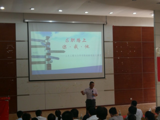 2017年9月24日上午,土木工程与力学学院创新创业大讲堂之“求职路上你、我、他”主题大会在逸夫楼第二报告厅圆满举行。本次主题大会由院学工办李壮老师主持,出席本次大会的嘉宾有:院党委副书记陈宾、招生与就业处就业资源开发科符文祥老师、中铁二十五局、中国一冶、新奥燃气集团等用人单位代表,以及2018届全体本科生和硕士研究生。