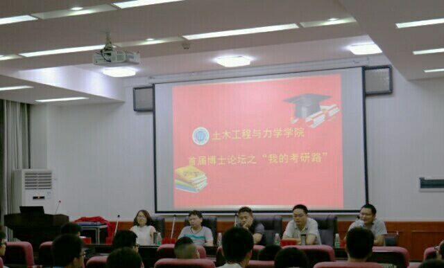 五位博士均来自不同的专业,依次给学生们讲述了属于自己的见解。涂佳黄博士讲述了自己考研过程中的努力不懈,鼓励同学们在考研路上一定要坚持;罗百福博士强调了考研时自我能力正确定位的重要性;丁俊博士让学生明白为何要读研,要有兴趣所在以及自己专业就业的现实。蒋秀姿博士作为全场唯一一位90后博士更是给了在座学生们莫大的鼓励;罗正东博士精心准备ppt为同学解读了他的考研之路。他将考研分为为五个部分——自我正确的认识、培养良好的生活习惯、制定好计划、合理释放压力、选择好的研友。“书山有路勤为径、风雨兼程至远方”是考研路的核心。