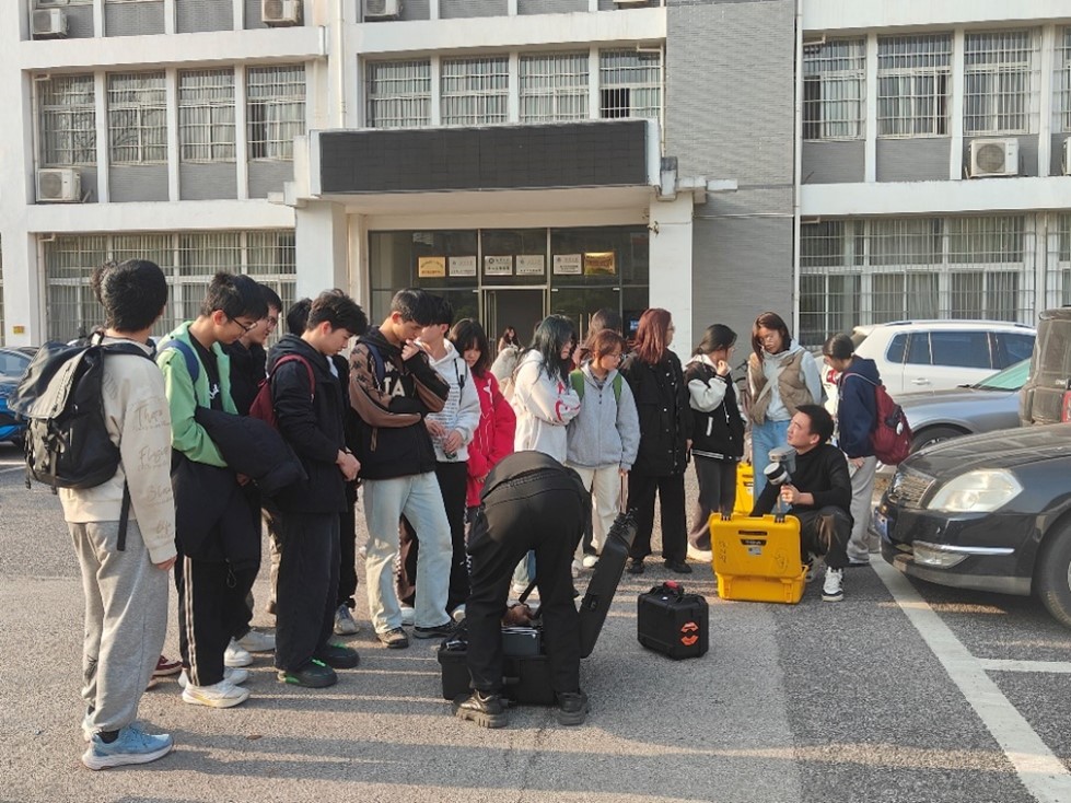 讲座结束后,同学们在华测导航专业技术人员的精心指导下,开启了一场别开生面的实践体验之旅。在土木楼周边,同学们分成小组,一组同学跟随技术员操作无人机,对土木楼周边区域进行航拍。无人机在技术员的操控下平稳起飞,同学们目不转睛地盯着屏幕,实时观察着航拍画面,感受着从空中俯瞰校园的独特视角。另一组同学手持激光扫描仪,围绕土木楼周围进行细致的扫描。他们认认真真地操作着设备,确保每一个角落都被精确记录下来。通过这一环节,学生们不仅体验了专业前沿的测绘设备,还深化了对测绘工程专业知识的认知,进一步拓展了理论与实践相结合的视野,激发了同学们对测绘事业的热情和信心。