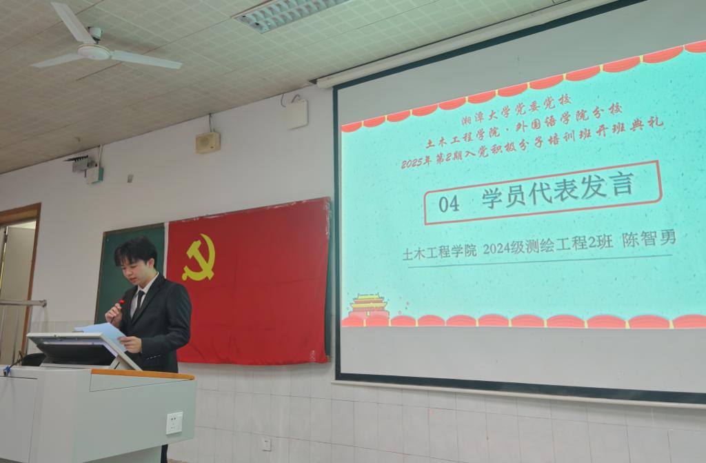 开班典礼在庄严的国歌声中拉开帷幕。外国语学院党委书记李锋对大家成为入党积极分子提出希冀和要求。24级测绘工程2班的陈智勇同学作为积极分子代表发言,他呼吁同学们按照学习要求,积极投入学习,争取早日成为一名合格的中国共产党员。